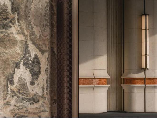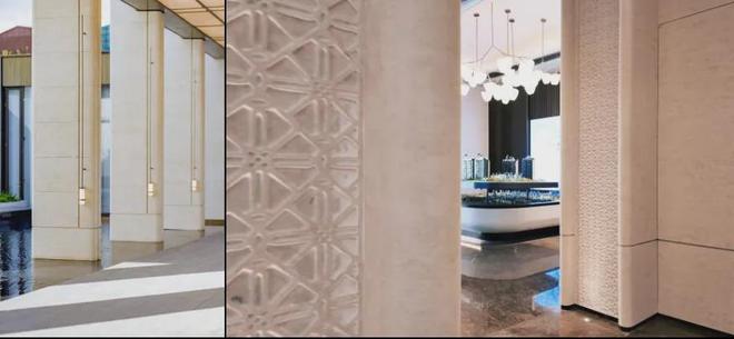 整个公区的引入沉香米黄、透光云石、安哥拉黑、福鼎黑、橙皮红、宝格丽紫等近二十种全球奢石,宛如一座流动的奢石博物馆。