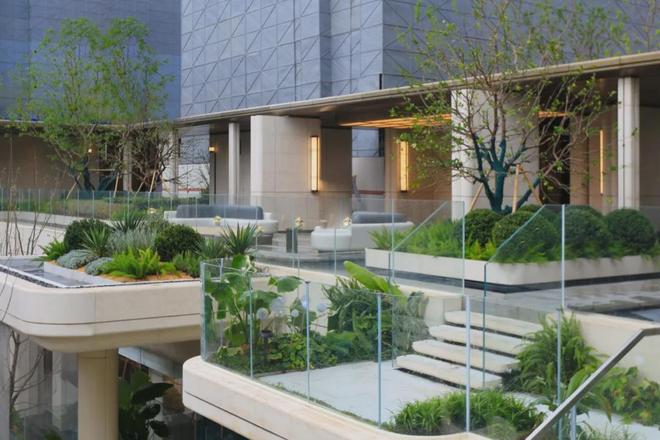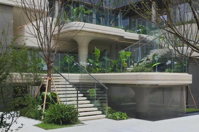 点睛之笔在于4层悬浮式阶梯,设计理念据说来自全球十二大奢华酒店之一的迪拜丽晶公寓,每一个观景露台都种植着不同的植被,一步一景,更重要的是,不同的露台对应着不同的观景视野点,将不同高度的下沉式庭院景观,通过极其优雅的方式传递给了业主。这个归家体验可以说是拉满了!
