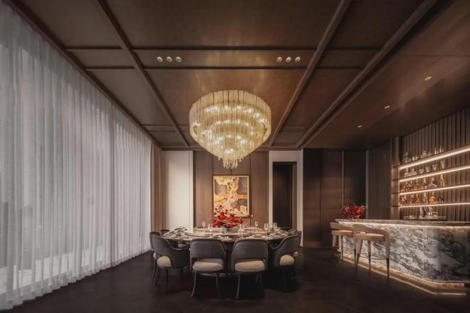 而业主专享的私宴厅则是将“尊贵感”说到了极致!臻选奢石营造雅致屏风,墙上大师匠呈繁花艺作,定制灯具璀璨生辉,摩登意蕴充盈其中,匹配大人物品位。除了敞阔的就餐空间,还独立配置吧台、品茗休息区。暮色四合,华灯初上,谈笑风生中展现风雅从容,觥筹交错间皆是繁华丰茂。