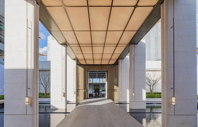 通过迎宾楼,便来到了约20米长的精神游廊,该精神游廊同源招商玺“树宅相守”的设计手法,更致敬建筑诗人斯卡帕“以自然光感去创造时间驻留感”的理念,通过对光线、材质与空间的创新打造,营造充满宁静的归家场域。