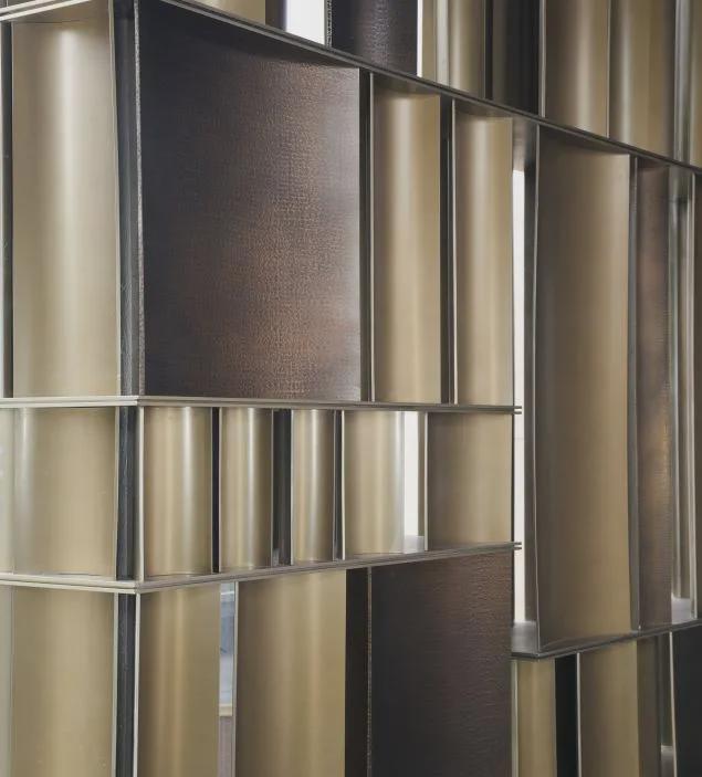一块游廊上的锤纹铜板深深打动了我,锤纹最早源于金银铜器的加工,“手落为一锤 四锤为一纹”,这块铜板需要通过匠人千百次的手工捶打才能形成阡陌纵横的纹路变化。这样的手工慢艺,在招商序的会所之中不止一处,在如今机械化模板化的时代之下,这份用心实为珍贵。