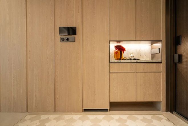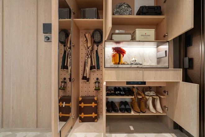 玄关收纳更精细,每个格子的规划都很贴近生活,随手物件,女主人的高靴,吸尘器等都有各自安置空间。