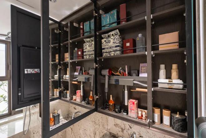 眼前一亮的是卫生间收纳,项目的镜柜是内外双镜,并且内部的收纳空间相当丰富,小到女主人的发箍、面膜、口红、香水,大到吹风机都有适合的位置。