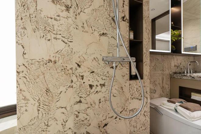 比如:除了卧室的拼花地板外,墙面与地面绝大部分都是岩板与奢石!就连卫生间的墙面、餐客厅外连通的阳台都做到了岩板通铺。