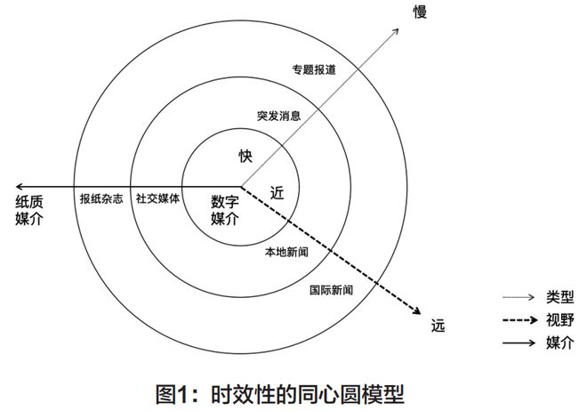 时效性是新闻生产时间在具体语境中的操作化手段,其实际内涵比“求新求快”更为具体丰富,涵盖类型、视野、媒介三个分类的维度,形成从快到慢、从近到远、从数字媒介到纸质媒介的内生性解释范畴。本文尝试用同心圆的模型来概括时效性的多重内涵(见图1):在同心圆的中心是数字新闻实践中最核心、常见的时效性解释,即快速发布的、关注本土的、发布在数字媒介中的消息;沿着类型、视野、媒介的维度向边缘扩散,又可以延伸出多种多样的时效性分支,例如间隔时间更长的社交媒体国际新闻、刊登在报纸杂志上的人物特稿等等。同一维度上的不同情况可能同时出现,譬如“网红记者”需覆盖多个媒体平台的时间规范等。