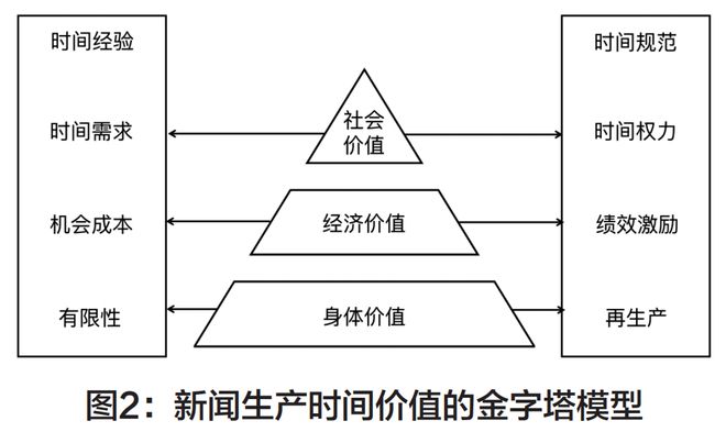 新闻生产时间价值可用三层的金字塔模型加以概括,每一层价值分别对应着时间规范和时间经验的不同维度,解释不同层面的新闻生产时间异化问题(见下页图2)。如前所述,新闻生产时间异化是指新闻生产活动的时间规范和时间经验之间存在矛盾,对个体造成心理负担和结构束缚。新闻生产时间价值可在身体、经济、社会三个价值维度解释经验和规范之间的冲突。