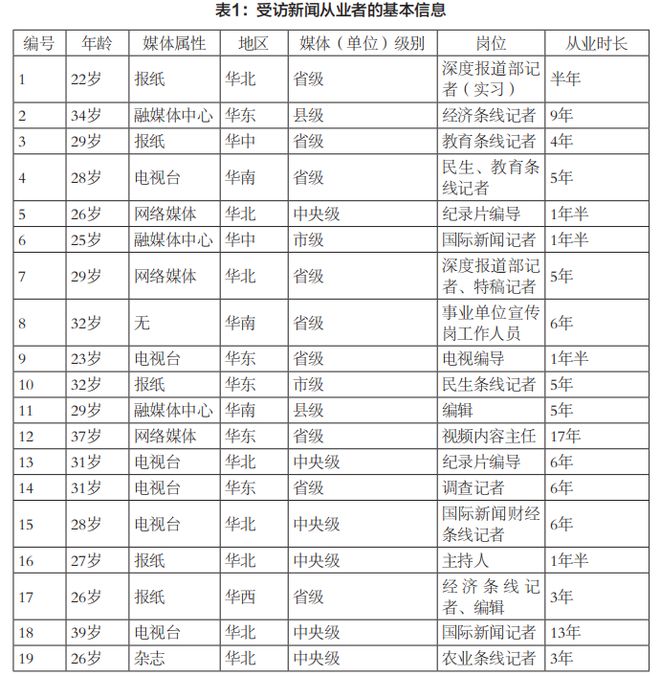 受访者的线上招募流程如下:研究人员首先在小红书平台中检索“记者”“媒体人”等关键词,再对明确分享过媒体从业经历的博主发起私信邀约,阐明研究主题、研究目的、访谈内容、录音请求、匿名处理原则等关键信息;最后在每次正式访谈开始前,再次确认受访者同意录音。研究人员从2023年10月至2024年8月通过腾讯会议采访了18位(前)新闻记者、编辑、主持人、编导、部门主任,同时采访了1位具有舆情分析经历的宣传工作者作为补充参考。访谈主要围绕新闻从业者工作节奏、生活节奏、职业生涯三大板块展开,每次访谈时长在45分钟至70分钟不等。受访者的工作地点遍及华北、华东、华南、华西、华中地区,就职单位包括中央、省、市、县四级媒体单位,从业时长范围在半年至17年之间。受访者来自报纸、杂志、电视、网络媒体等不同属性的媒体机构。但必须明确的是,多数媒体机构已经进行了融合与转型。为表述方便,下页表中受访者工作单位的“媒体属性”主要指机构成立时的媒介形态。具体的受访者信息详见表1。