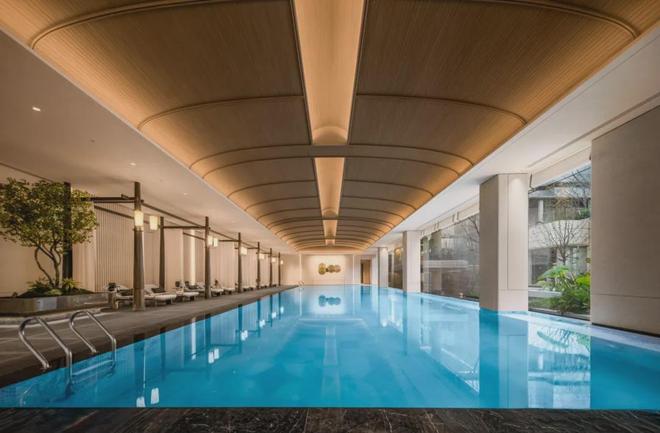 最让我心动的是这个无边泳池!招商序以“室内外自然无界”的设计手法,将无边泳池与庭院美景在视觉上连成一体,当阳光映照跃动的蔚蓝,业主畅游的同时还能包揽庭园诗意;深色木架构撑起白色帏幔,池边躺椅的设计也极具豪华酒店的优雅与尊贵,穹顶则延续着海派穹顶的经典设计元素,以细腻的木纹铝板打造。以往只在奢华度假酒店的体验在家楼下的会所也能拥有!